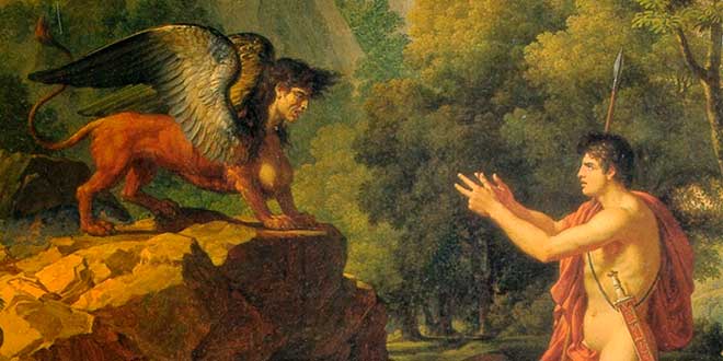 Por su parte, la imagen mitológica, de origen griego, pertenece al cuadro ‘Edipo y la Esfinge’, pintado por Gustave Moreau (1864), y en la actualidad se expone en Nueva York, en el Metropolitan Museum of Art. La pintura (óleo), sobre lienzo (206x105 cm), representa el momento en que la Esfinge (bello monstruo con cabeza de mujer, cuerpo de león y alas de águila) pone a prueba a Edipo, que después de responder a tres difíciles acertijos se dirigirá a la ciudad griega de Tebas, sueño de cualquier ciudadano de la época.