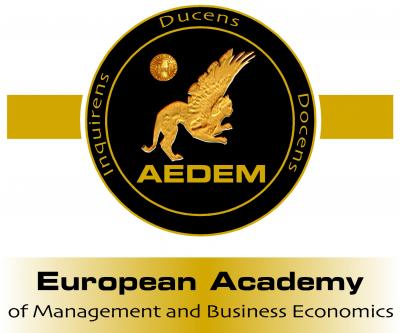 de la Academia Europea de Dirección y Economía de la Empresa (AEDEM) se compone de su patronímico, en lengua inglesa, sobre el que descansan dos símbolos contenidos en otros tantos círculos concéntricos. Uno de estos símbolos es alegórico, si bien el conjunto se vincula a la esencia y la filosofía de la institución. De ambos elementos, el animado responde a una figura pictográfica perteneciente a un lienzo que, a su vez, inmortaliza una leyenda; mientras que el otro dibuja una moneda antigua. Circundan la enseña en su perímetro, a modo de doctrina, tres vocablos latinos relacionados con la enseñanza y la investigación: Ducens, Docens e Inquirens.